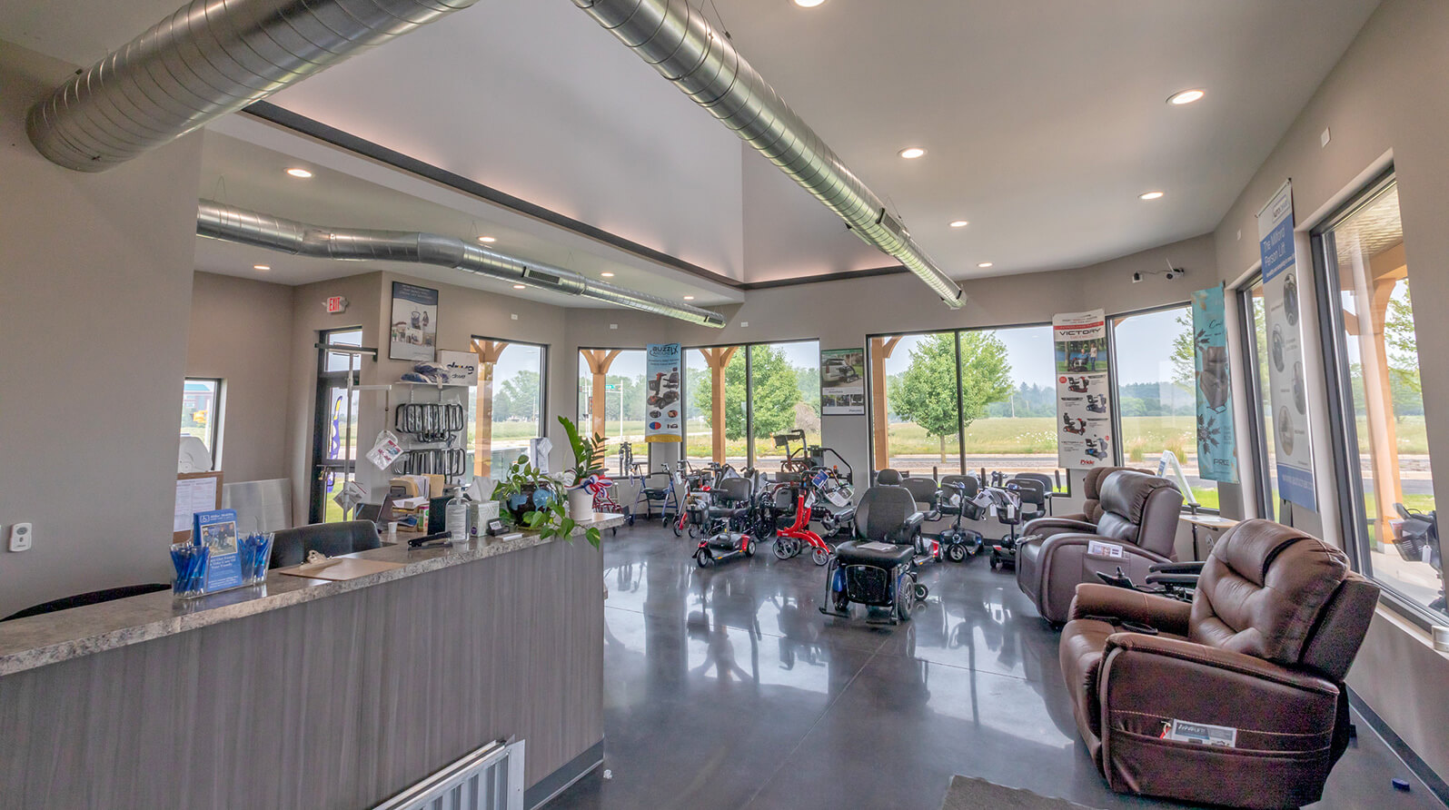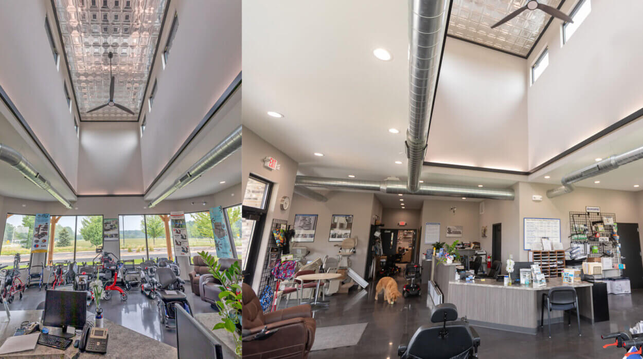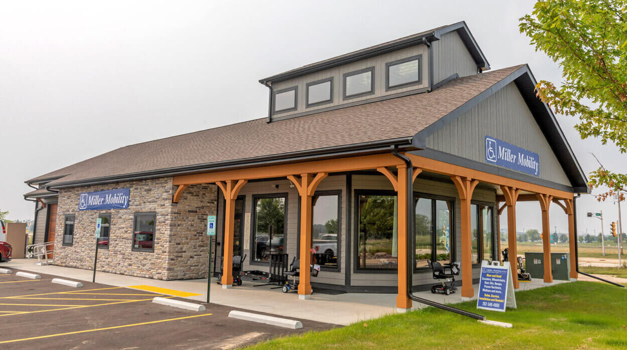 Miller Mobility is an extensive resource for mobility and medical equipment. As a family-owned business, the owners wanted to provide clients with a true at-home showroom experience. The modern farmhouse aesthetic of their 3,200-sq.ft. building offers a welcoming appeal in its commercial park location adjacent to a prominent hospital. The new retail environment includes showroom and office space as well as inventory storage and an outdoor display area.